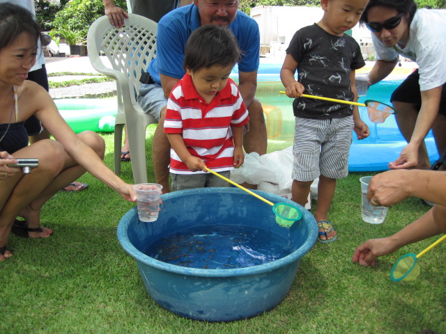 セイジは庭で金魚すくいをしていましたとさ。